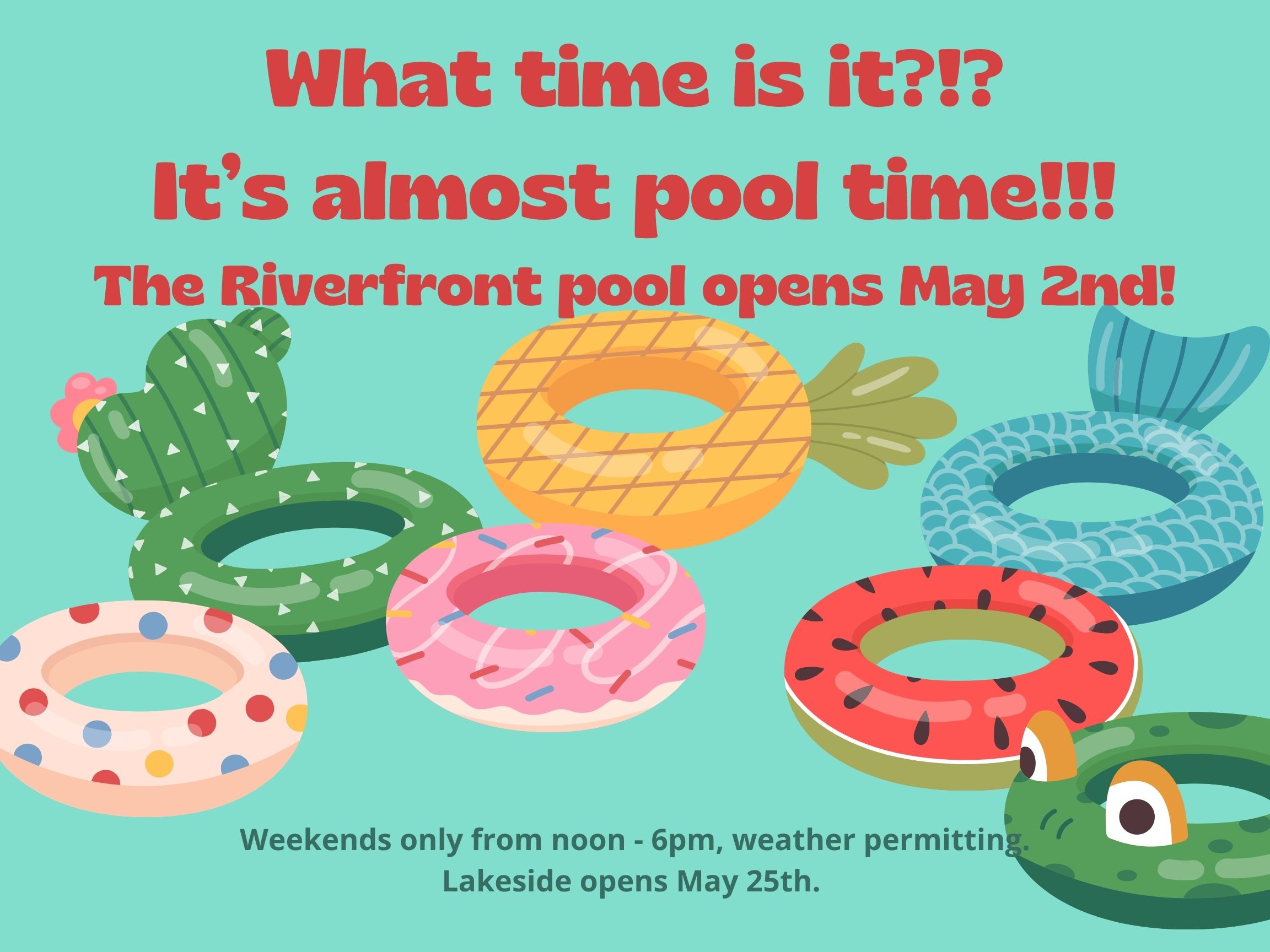 What time is it?!?It’s almost pool time!!!The Riverfront pool opens May 2nd! Weekends only from noon – 6pm, weather permitting.Lakeside opens May 25th.